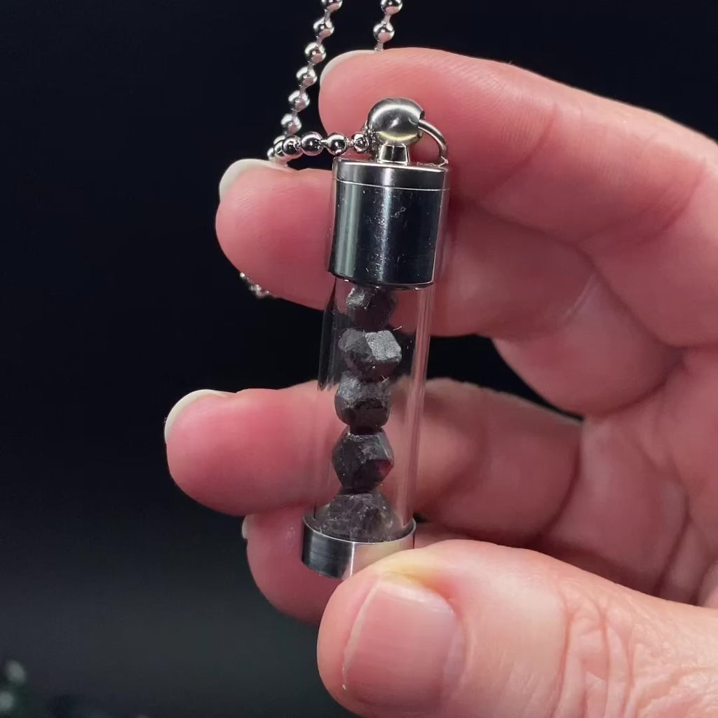 Stainless steel and glass vial pendant with high quality almandine garnet crystals. Each vial will contain approximately 5 to 7 small garnets.