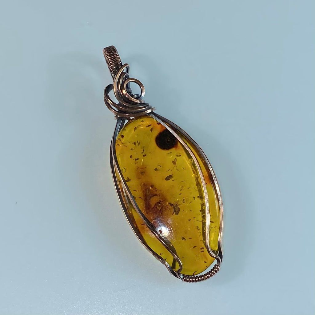 Gorgeous amber specimen with inclusions wrapped in oxidized copper wire.