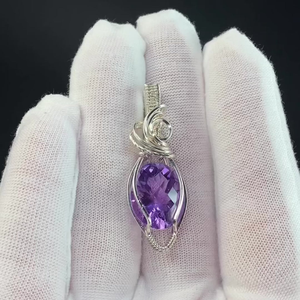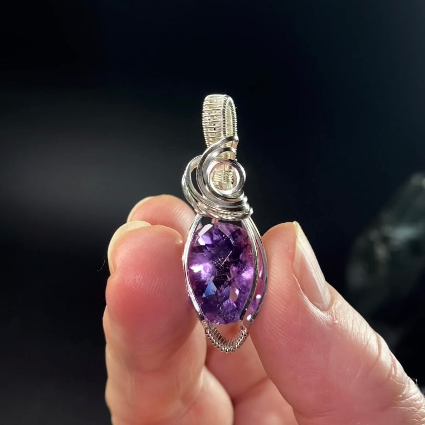 Faceted oval amethyst stone wrapped in sterling silver wire.
