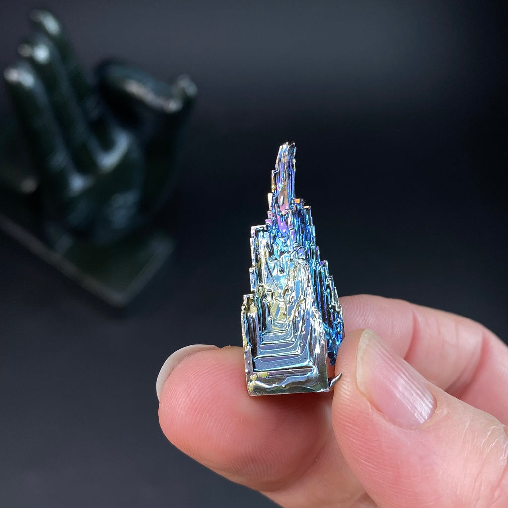 Each piece is created by carefully cooling molten bismuth, allowing the metal to form its iconic hopper-style stair-step crystals and metallic rainbow colors. These clusters display a mix of electric blues, golds, magentas, and greens that shift beautifully in the light.