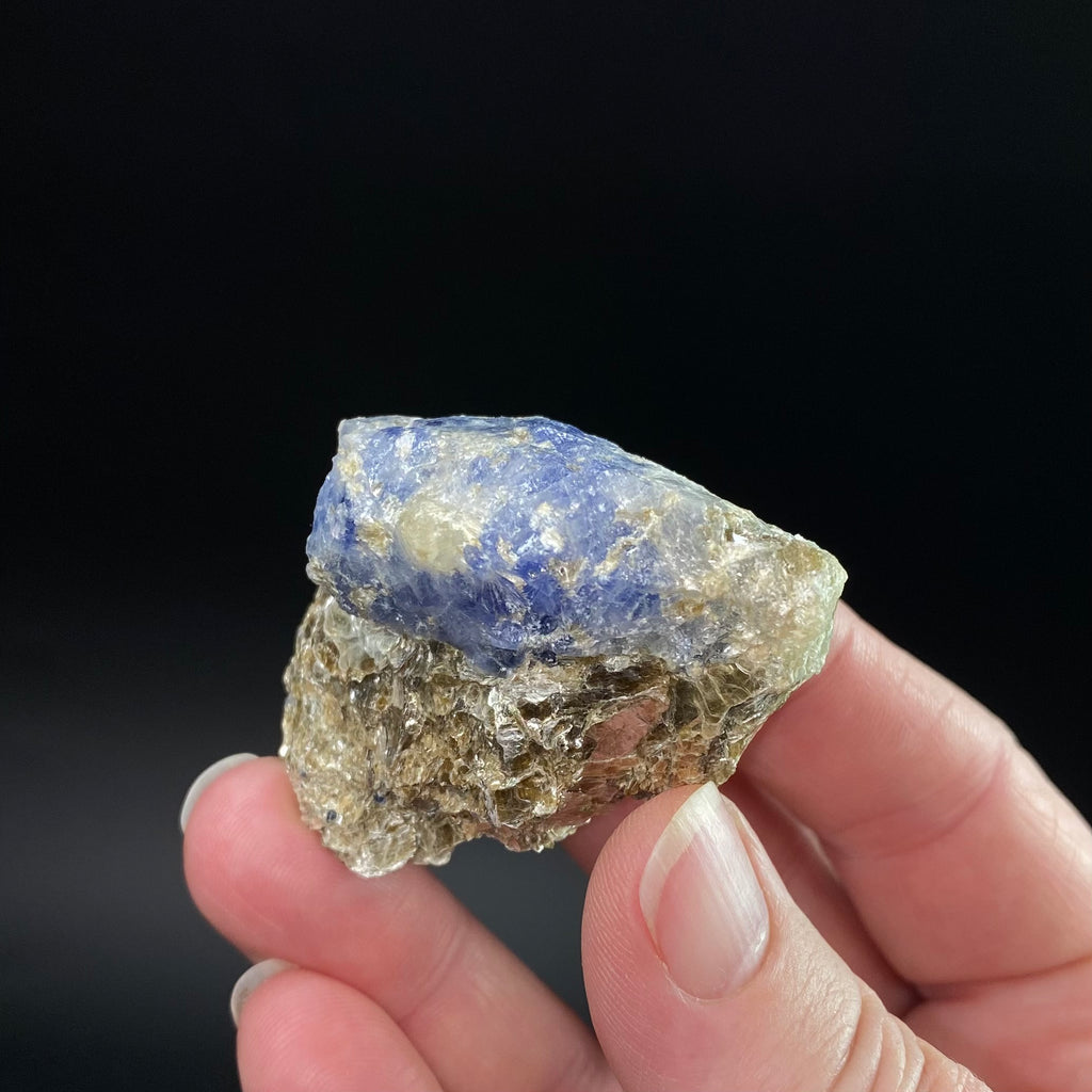 Blue sapphire with mica schist. Koksha Valley, Kuran Wa Munjan District, Badakhshan, Afghanistan Size: 50 x 30 x 20 mm. 54 grams.