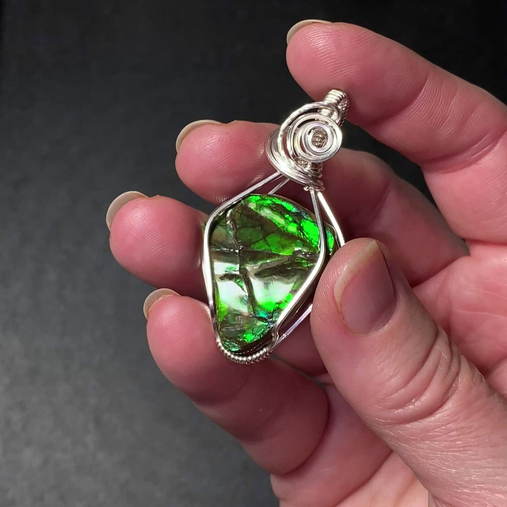 Korite Canadian ammolite & sterling silver wire wrapped pendant.