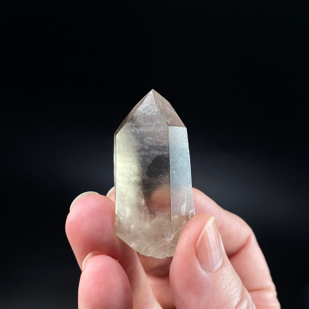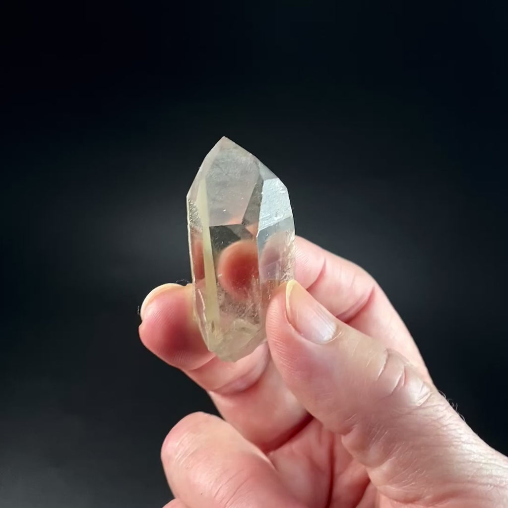 Channeling quartz crystal with a seven sided face opposite a 3 sided face. There are a few small chips at edges. Forward time link