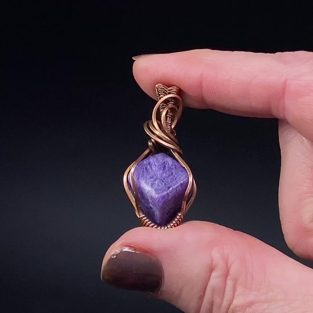 Polished charoite wire wrapped pendant with oxidized patina copper wire.