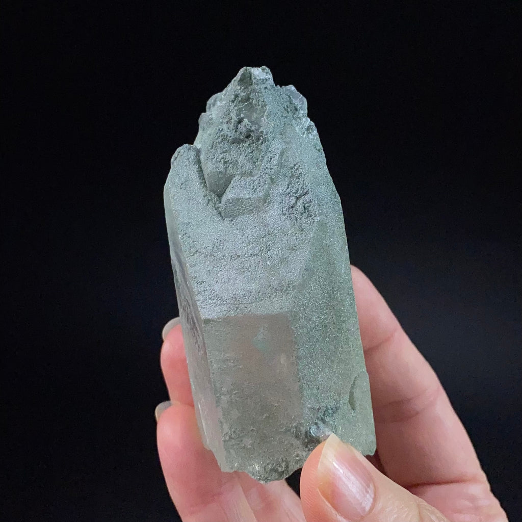 Uniquely terminated quartz crystal with a shimmery natural chlorite surface deposit on the front and side of the crystal. Some areas on the side / back do not have as much or any of the chlorite.
