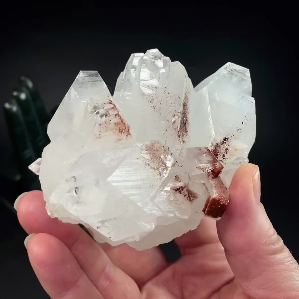 Beautiful cluster of clear apophyllite crystals with some hematite inclusions.