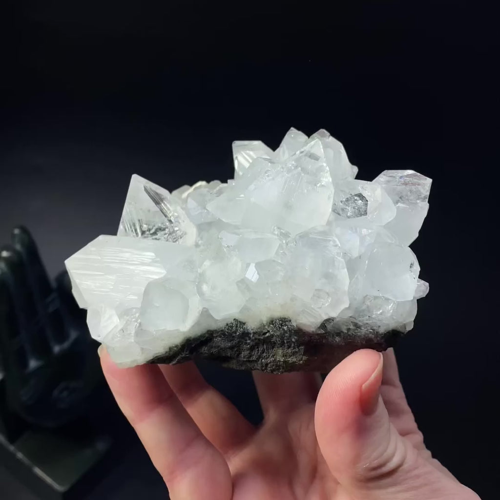 Beautiful cluster of clear apophyllite crystals over a basalt matrix remnant.