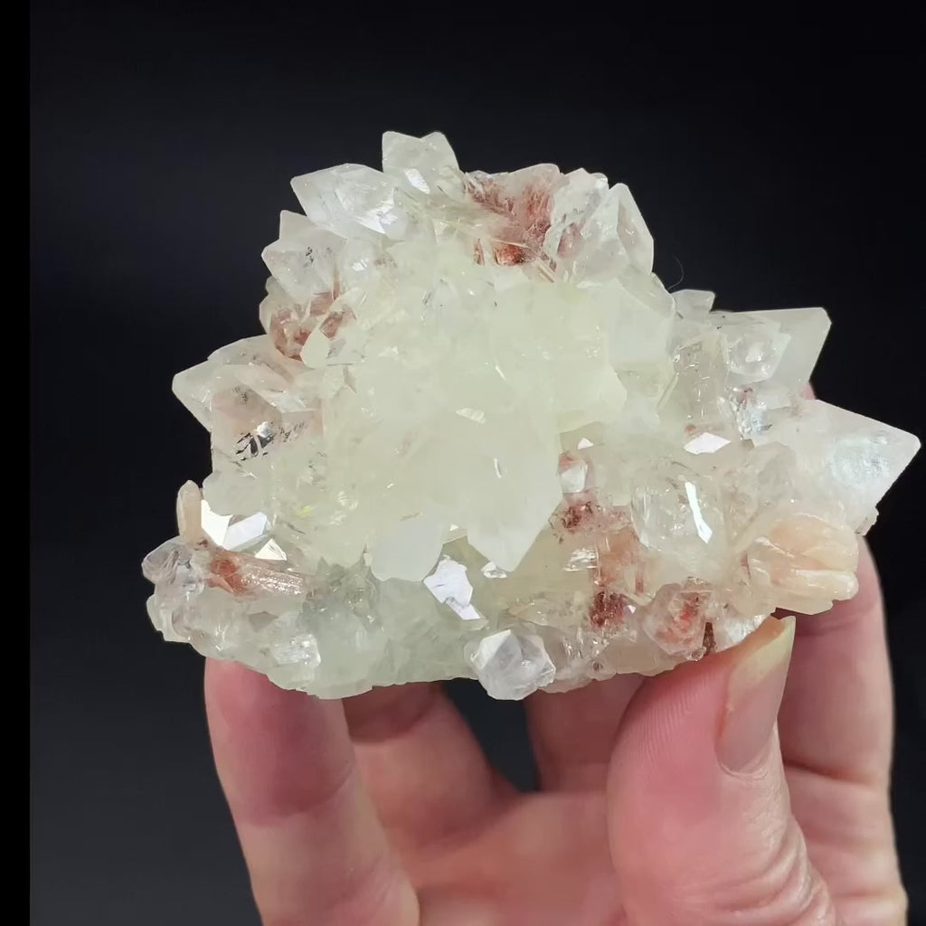 Beautiful cluster of clear apophyllite crystals with some hematite inclusions, along with peach color stilbite crystals on one side of the cluster.