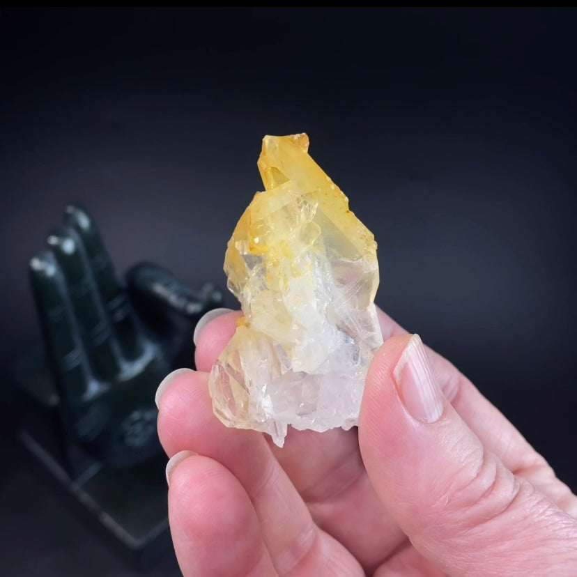 Beautiful clear faden quartz crystal cluster with a natural golden yellow iron oxide coating. There are some pretty rainbows in the area of the faden line.