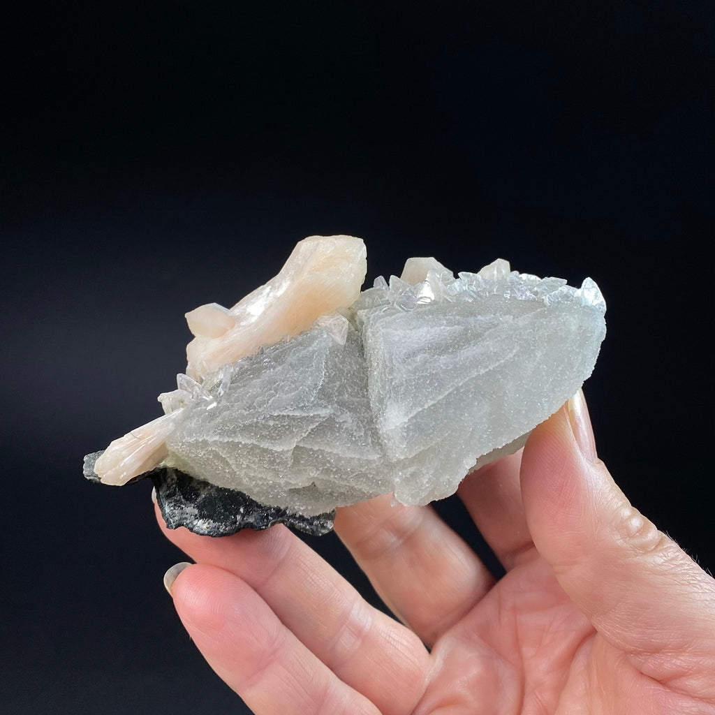 This specimen features peach stilbite and clear small Heulandite crystals on sparkly chalcedony covered calcite crystals that sit on a small basalt matrix remnant.