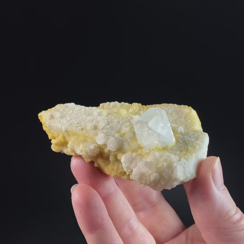 Beautiful clear / white topaz crystal on microcline feldspar with late-stage small lepidolite mica rosettes. Iron oxide gives a golden hue in some areas.