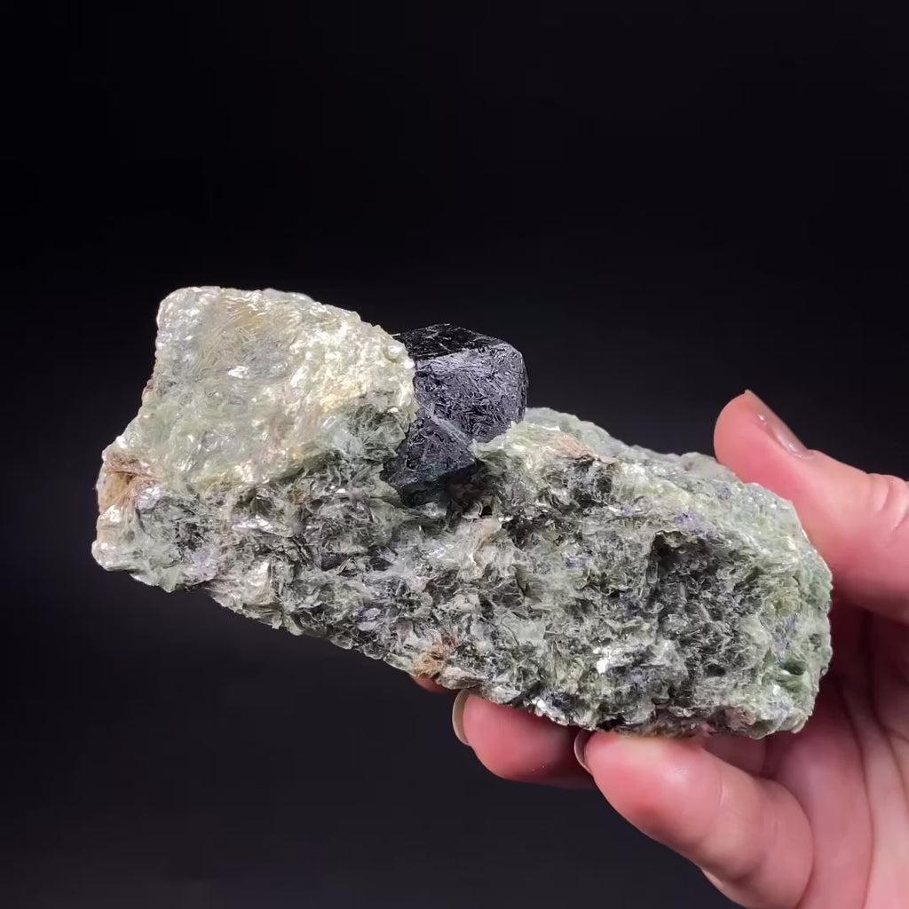 This is a large, blue dravite/uvite crystal in a green mica-rich matrix with small gemmy-blue sapphires. The crystal displays a perfect ditriagonal pyramidal crystal habit. These specimens first surfaced in the gem markets of Peshawar, Pakistan, in late 2009.