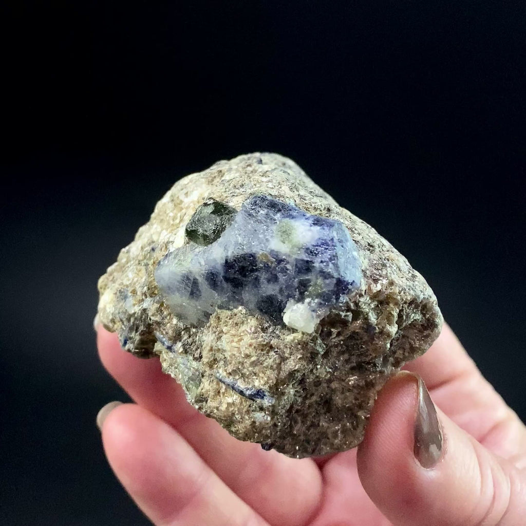 Sapphire and dravite tourmaline crystals in mica schist matrix. Koksha Valley, Kuran Wa Munjan District, Badakhshan, Afghanistan Size: 50 x 45 x 30 mm. 149 grams.