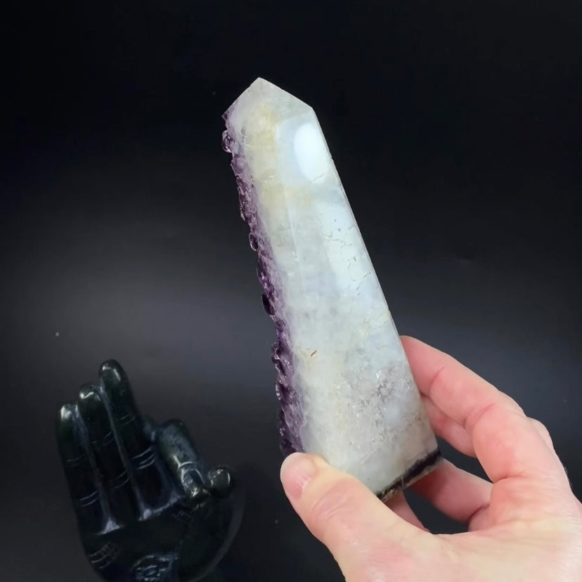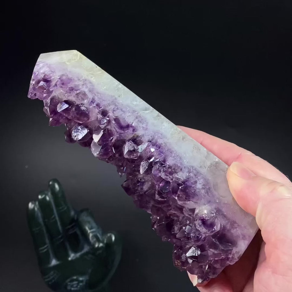 Vibrant purple amethyst crystal tower that has been polished on three sides.