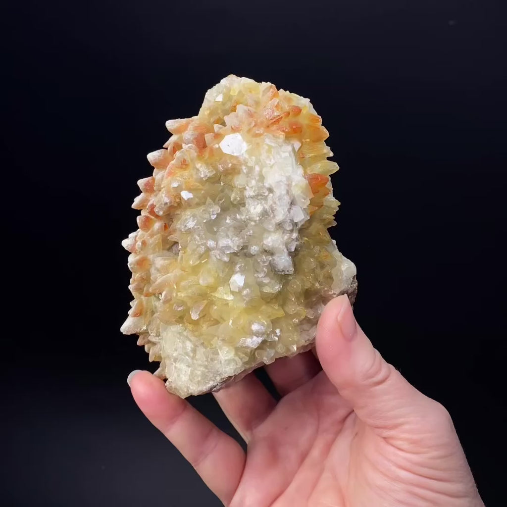 This is a beautiful golden yellow and orange calcite cluster with and iron oxide surface coating. Some of the calcite has iridescence.