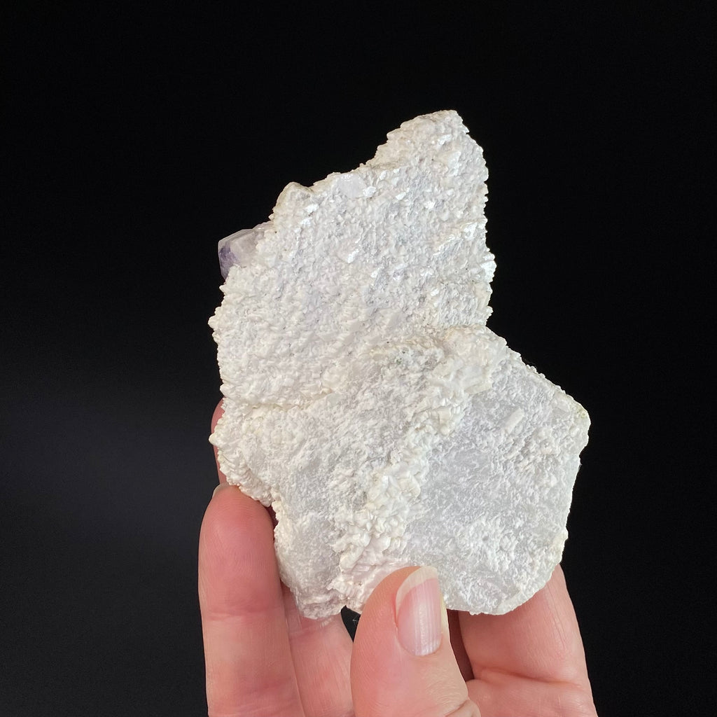 Two main double terminated purple and white bi-color apatite crystals with multiple smaller crystals on a matrix of microcline feldspar with a secondary mineral on the surface. Very unique etched look.