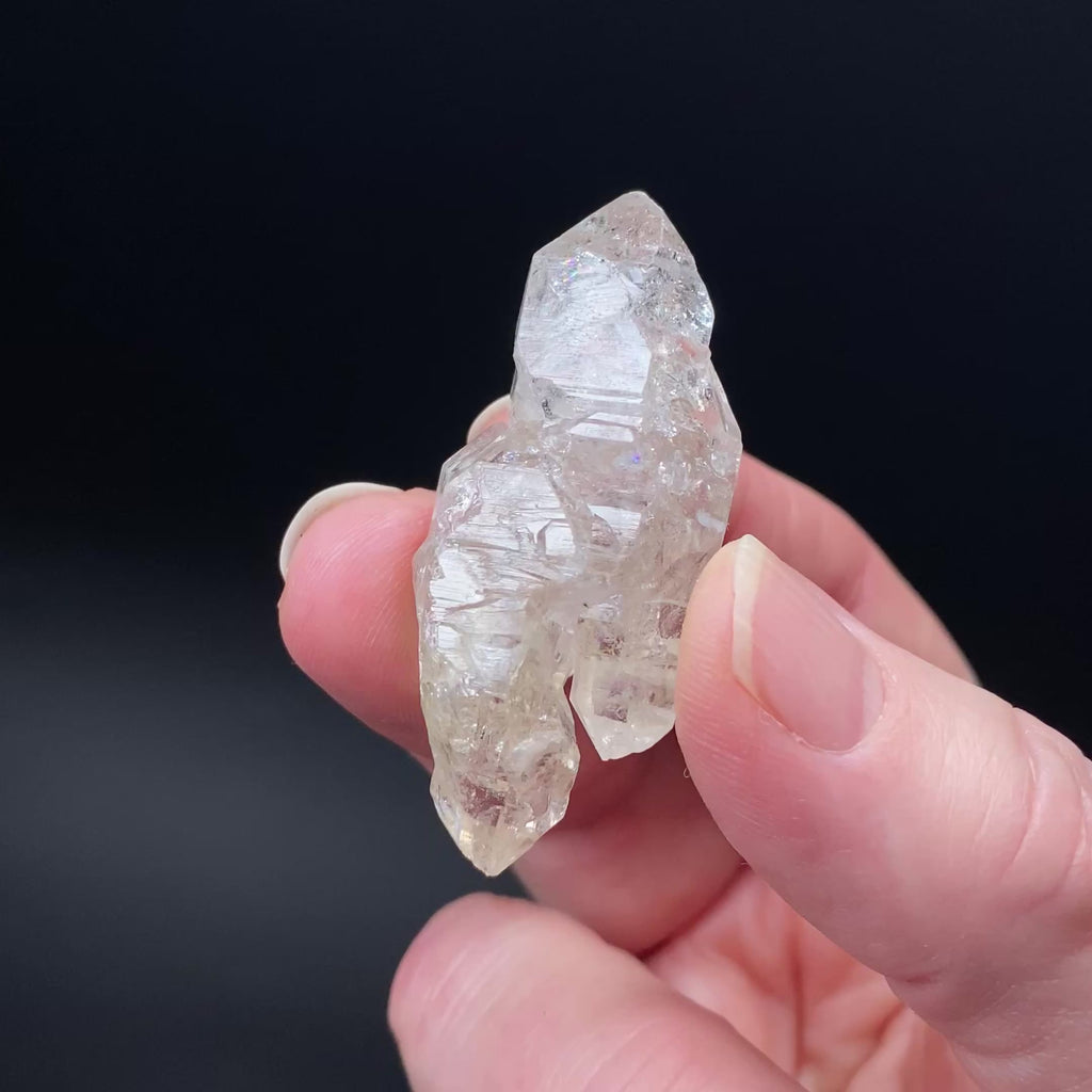 Clear, intergrown quartz crystal with double terminations. There are multiple rainbows.