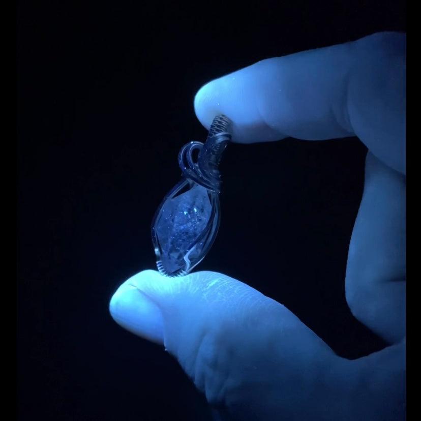 Double terminated petroleum included quartz crystal wrapped in sterling silver wire. The petroleum inclusions fluoresce white / blue with 365nm long wave UV. There are only a couple areas with fluorescence in this stone.