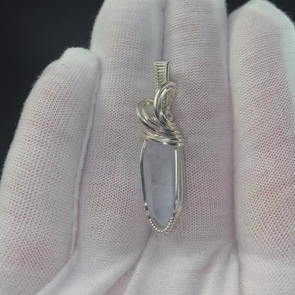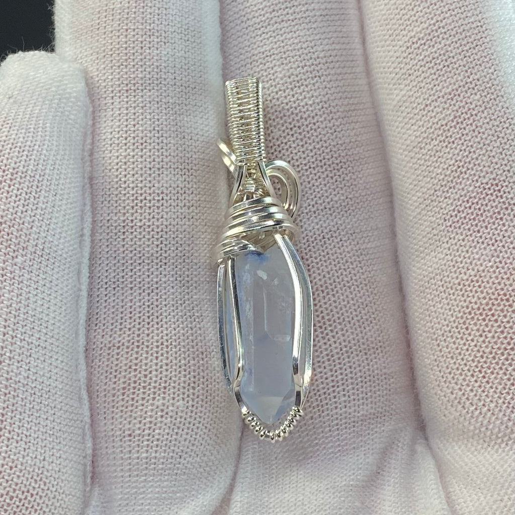 Elevate your crystal jewelry collection with this handmade dumortierite included quartz pendant, wrapped in high-quality .925 sterling silver. This unique gemstone features natural blue dumortierite fibers suspended inside clear quartz, creating beautiful pastel blue color in this single terminated crystal.
