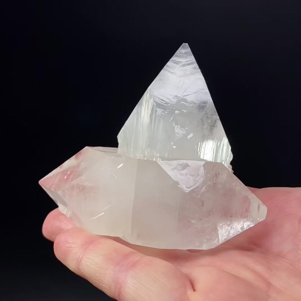 Beautiful and extra large cluster of two inter grown clear apophyllite crystals. One of the crystals is complete and the other has half of the crystal. A smaller cluster of crystals in one area.