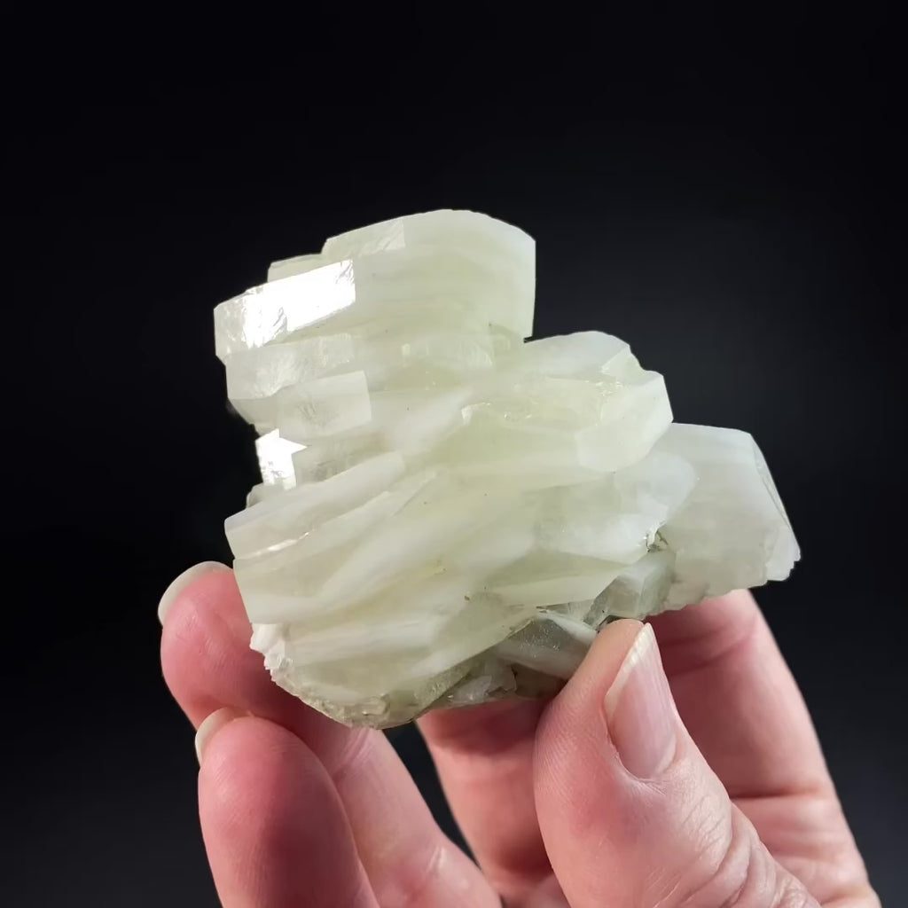 Highly lustrous hexagonal sandwich calcite crystals in a stacked formation. Each stacked, tabular hexagonal calcite crystal shows an interlayering of white and clear/greenish calcite. The clear/light green layer has an alternating point-up/point-down triangular geometry visible on the side faces. Slight green tint is from hedenbergite. The bottom has been smoothed a bit and there are some matrix mineral remnants.