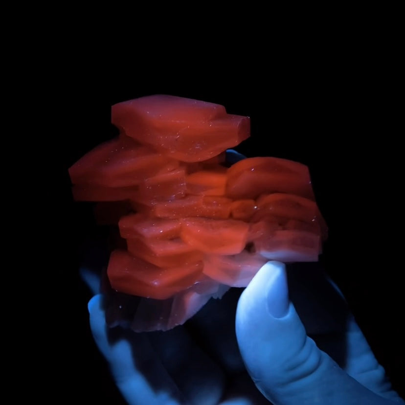 The calcite fluoresces a vibrant orange under 365nm long wave ultraviolet light.