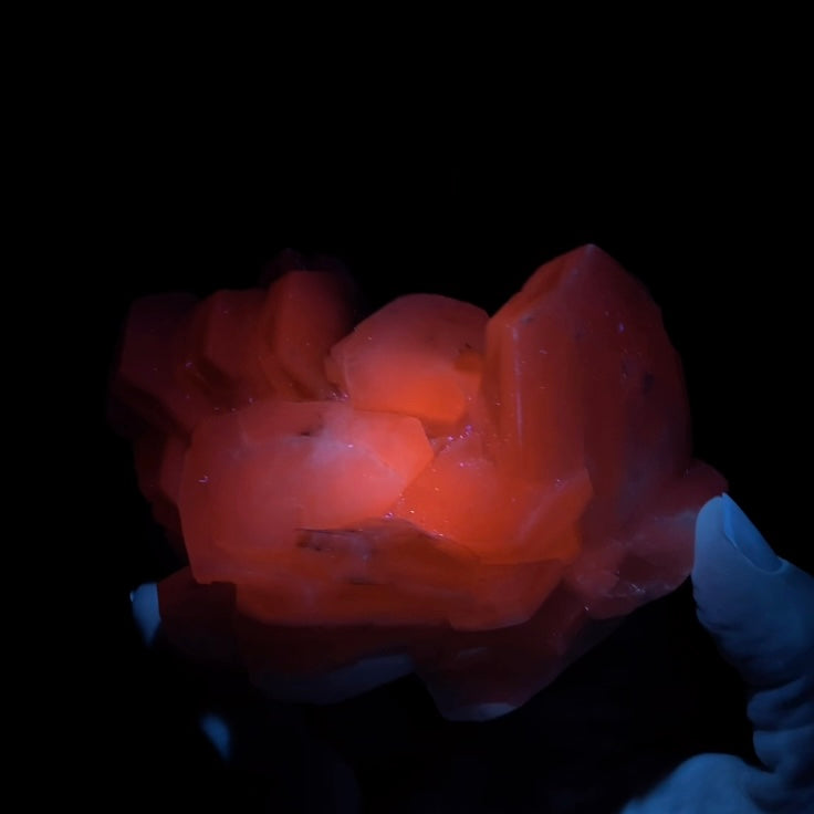 The calcite fluoresces a vibrant orange under 365nm long wave ultraviolet light.