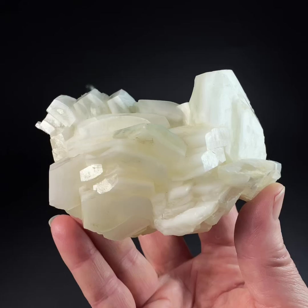 Highly lustrous hexagonal sandwich calcite crystals in a stacked formation. Each stacked, tabular hexagonal calcite crystal shows an interlayering of white and clear/greenish calcite. The clear/light green layer has an alternating point-up/point-down triangular geometry visible on the side faces. Slight green tint is from hedenbergite. The bottom has been smoothed a bit and there are some matrix mineral remnants.
