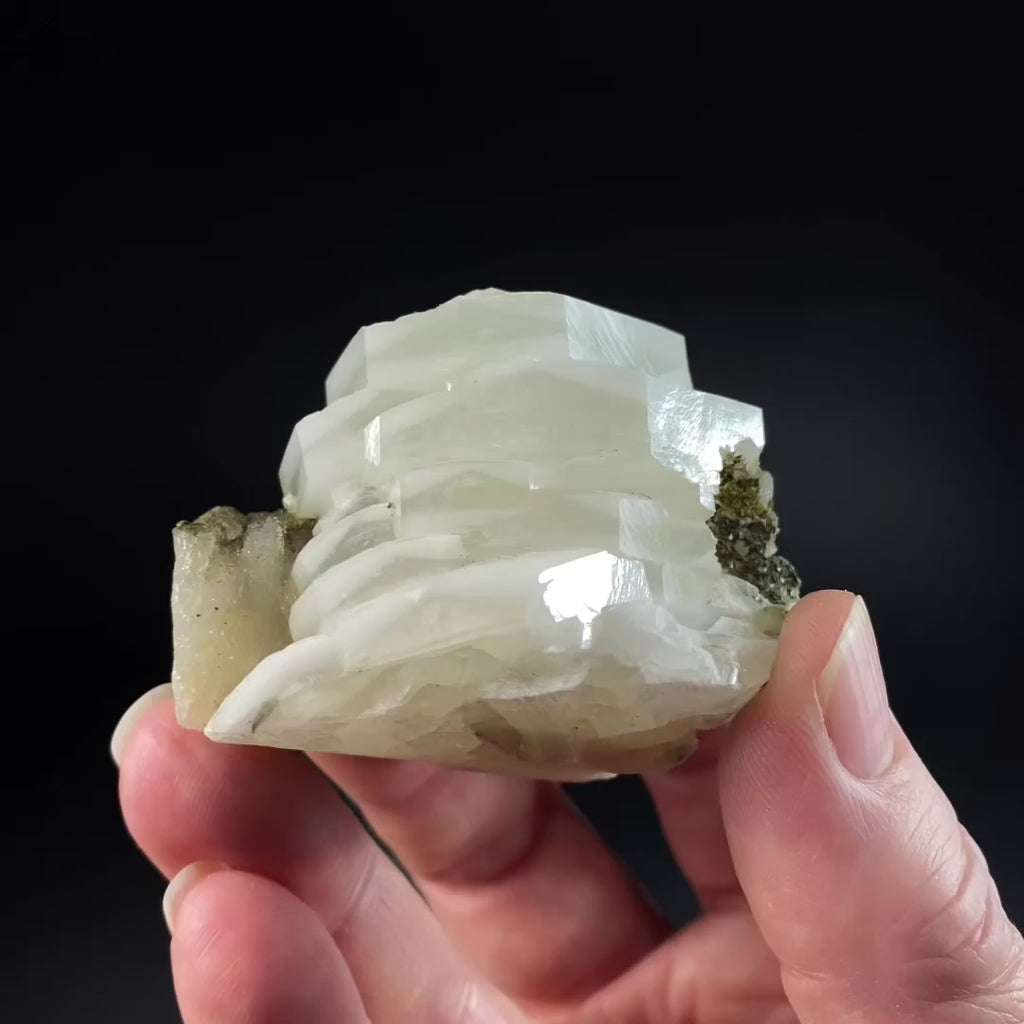 Multiple hexagonal "sandwich" calcite crystals in a stacked formation on matrix. Each stacked, tabular hexagonal calcite crystal shows an interlayering of white and clear/greenish calcite. The clear/light green layer has an alternating point-up/point-down triangular geometry visible on the side faces. Slight green tint is from hedenbergite.