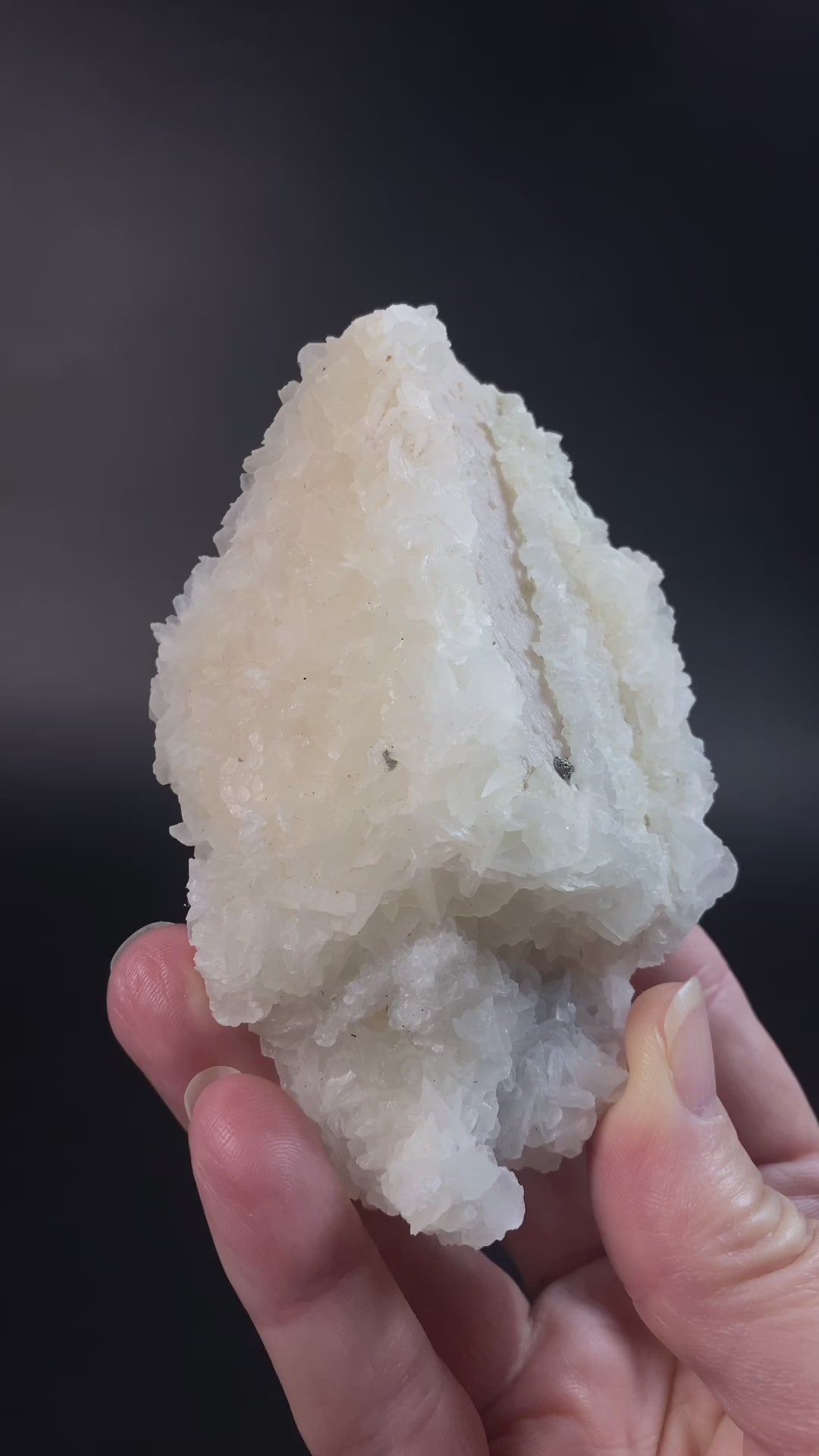 Pink rhombic mangano calcite covered in a layer of white calcite crystals in certain areas. The calcite glows a beautiful orange color under UV light.