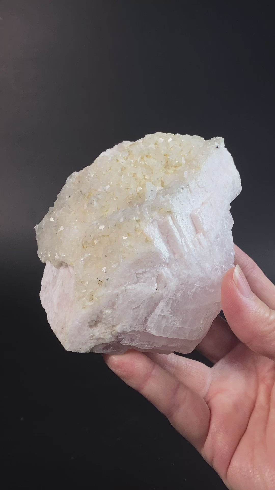 Beautiful pink mangano calcite with clear / white calcite crystals on the surface of the pink calcite.