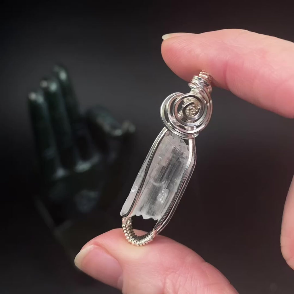 Beautiful clear spodumene var. kunzite crystal wrapped in sterling silver wire. There is just a slight hint of pink near the ends. Each end has multiple small terminations.