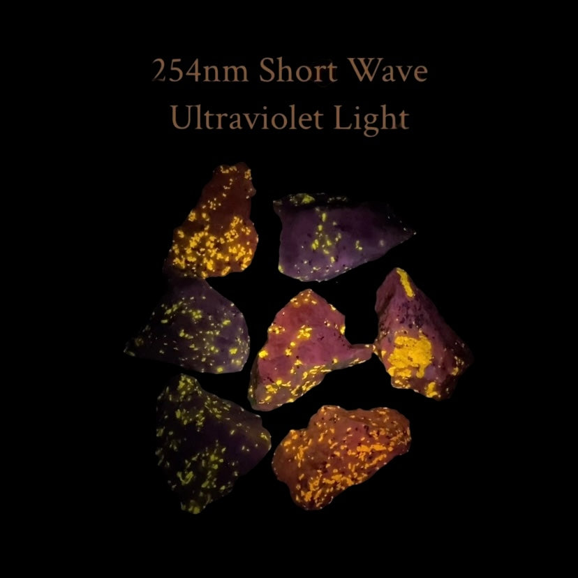 The wollastonite fluoresces a golden yellow, and the calcite fluoresces a magenta color under 254nm short wave UV. With 365nm long wave UV, you will see the wollastonite but not much of the calcite fluoresces.
