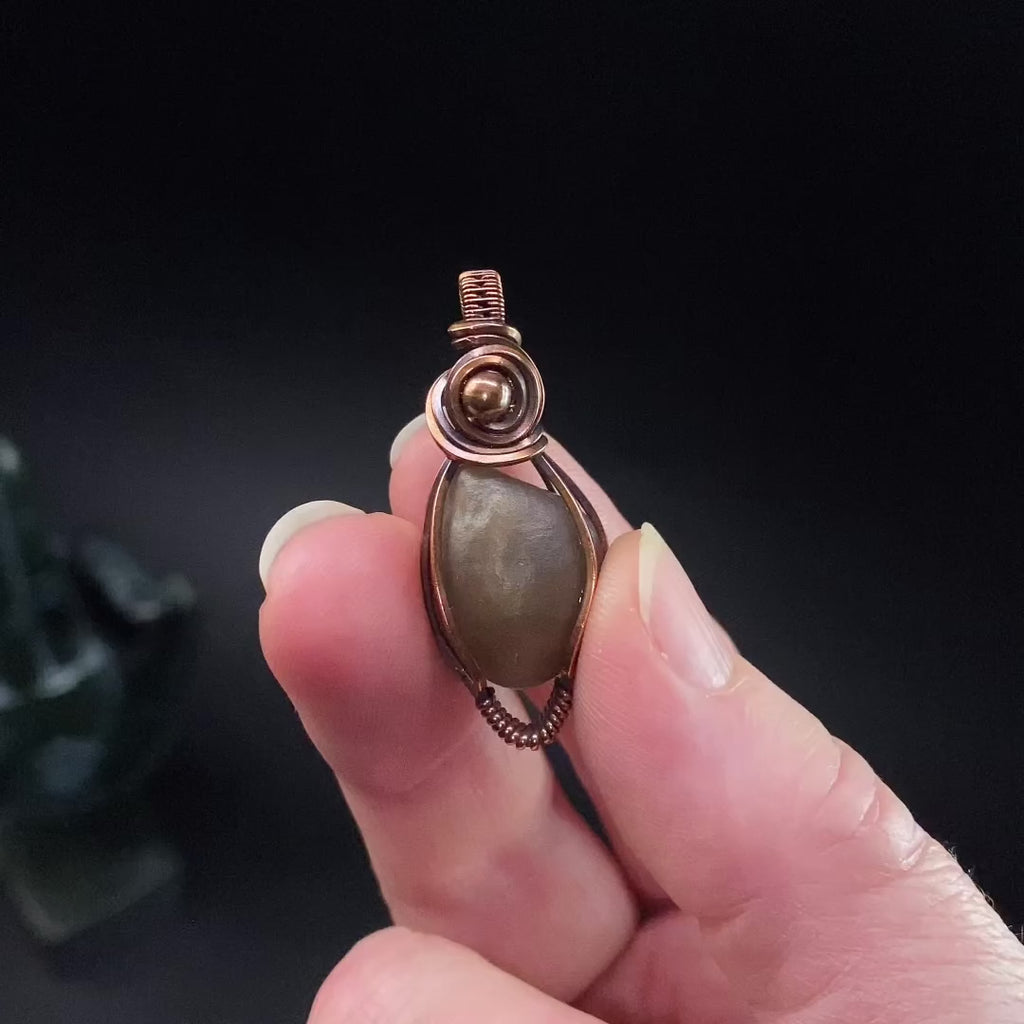 Beautiful tan color gobi desert agate WITH MOVING SAND INCLUSIONS and copper wire wrapped pendant.