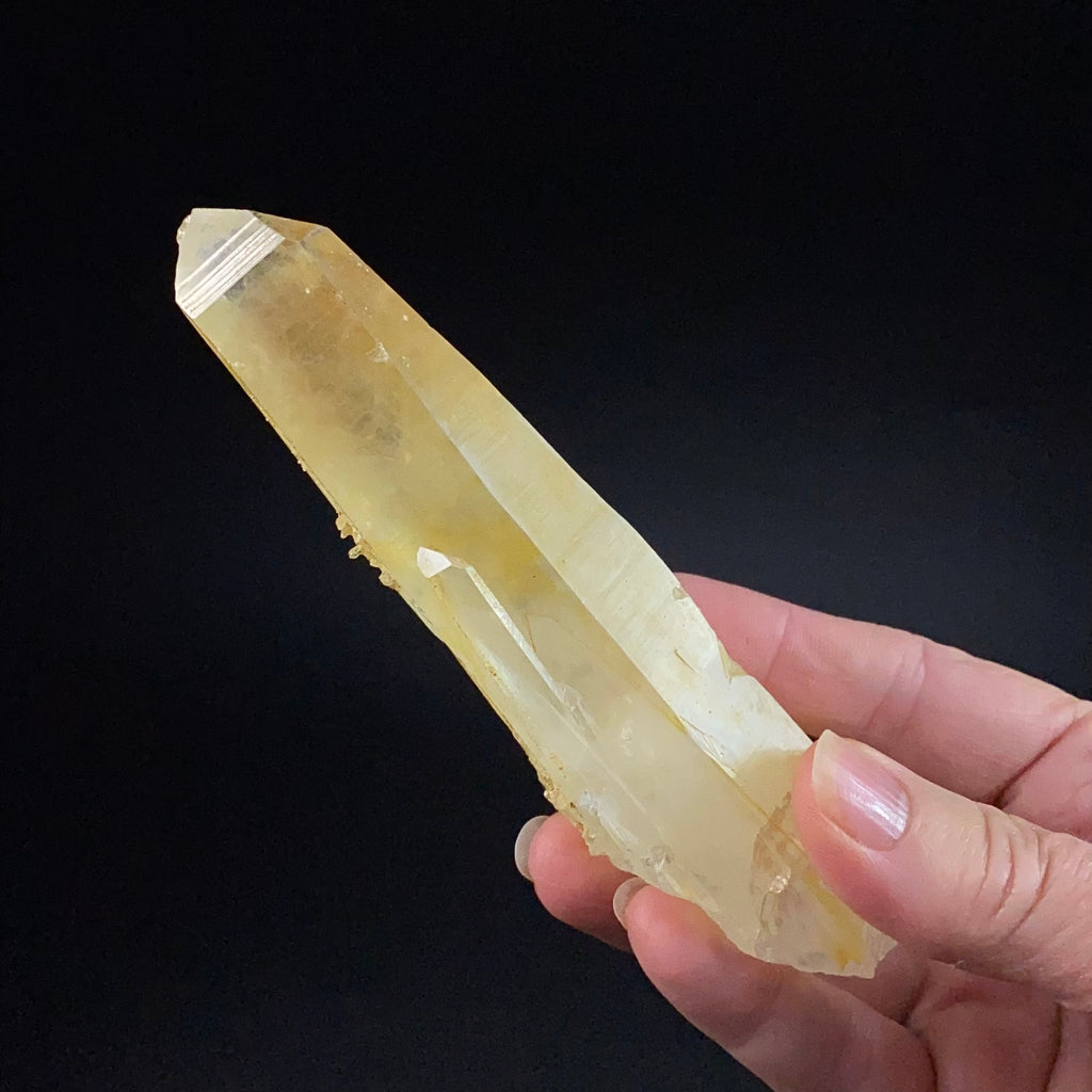Beautiful large trigonal habit golden quartz crystal with a natural yellow iron oxide coating. There are smaller crystals protruding from the crystal on 3 sides.