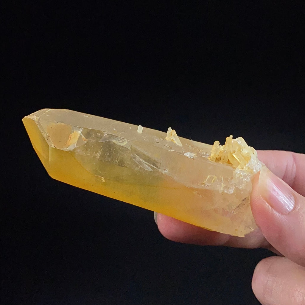 Beautiful golden quartz crystal with a natural yellow iron oxide coating. There are smaller crystals protruding from the crystal on 1 side.