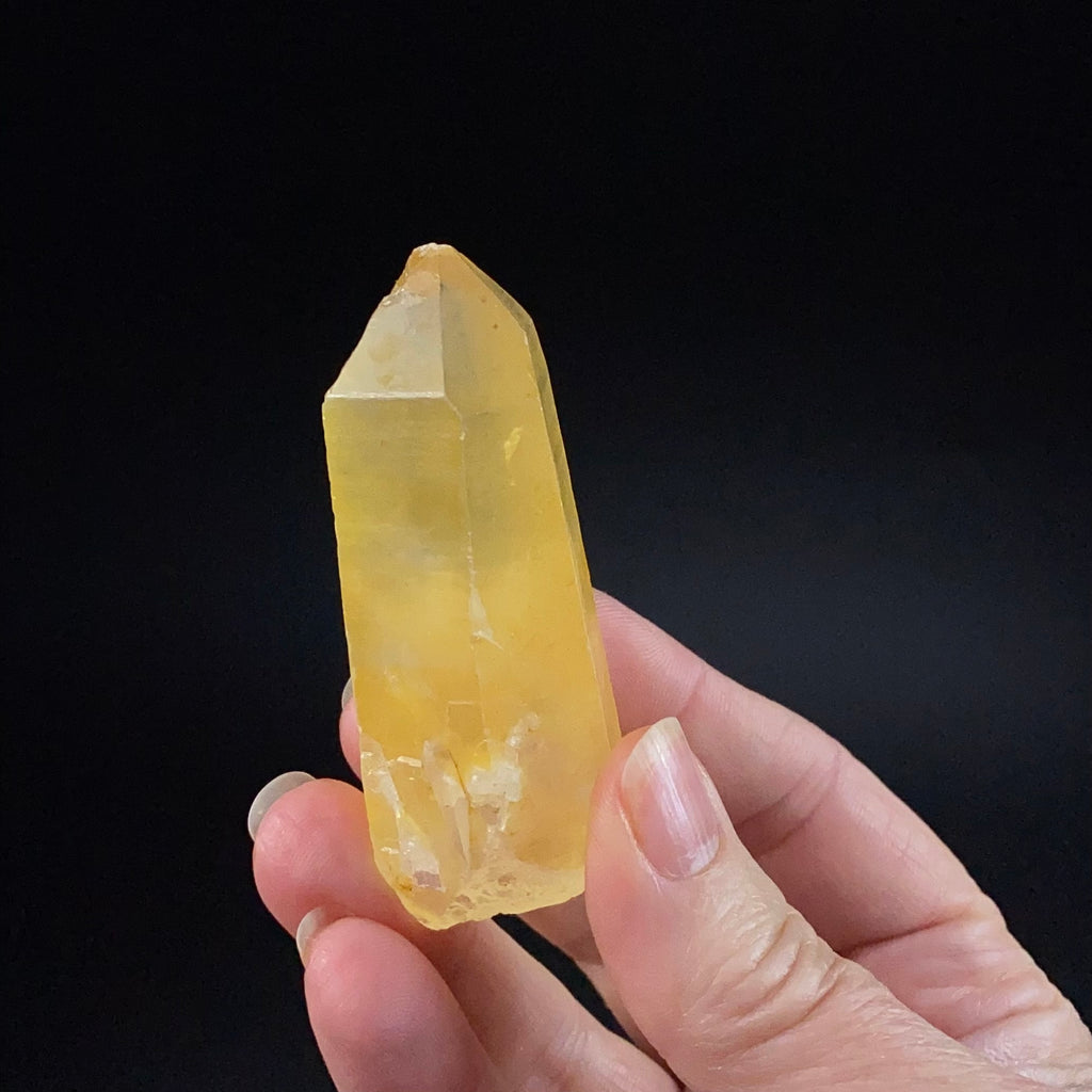 Beautiful golden quartz crystal with a natural yellow iron oxide coating.The termination is damaged with some dings.