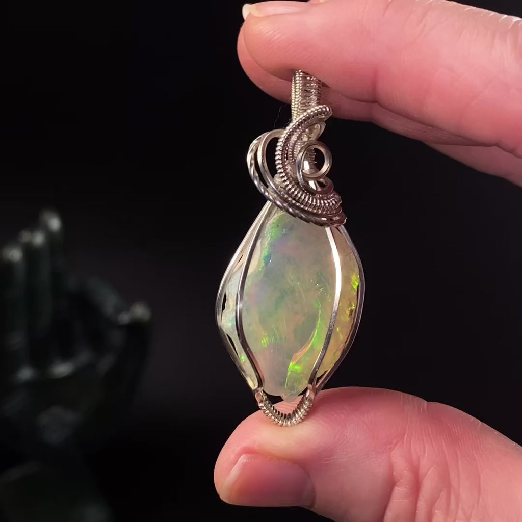 Raw Ethiopian welo opal with gorgeous green and orange flash wrapped in sterling silver wire.