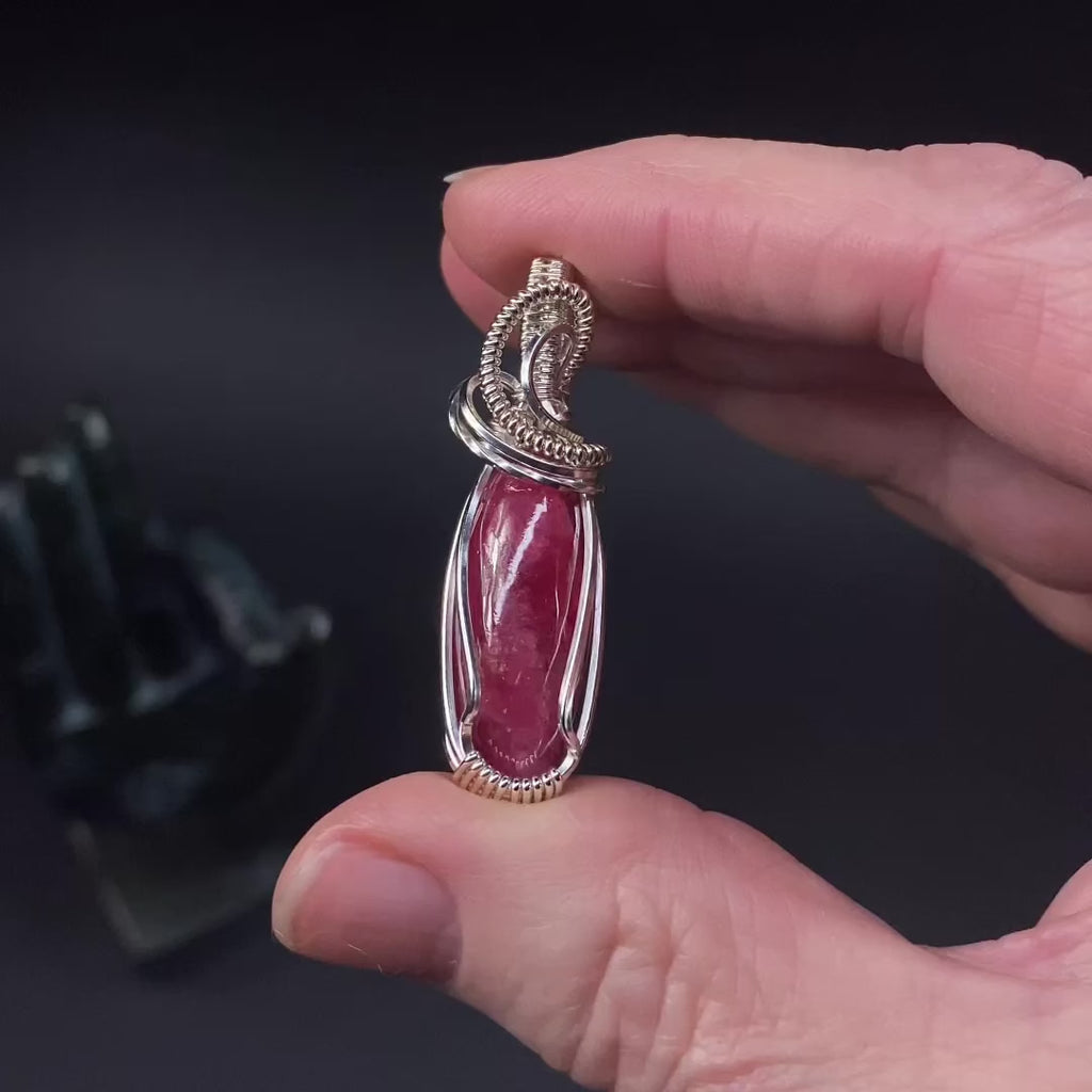 Beautiful bright red rhodonite that has been wrapped in sterling silver wire.