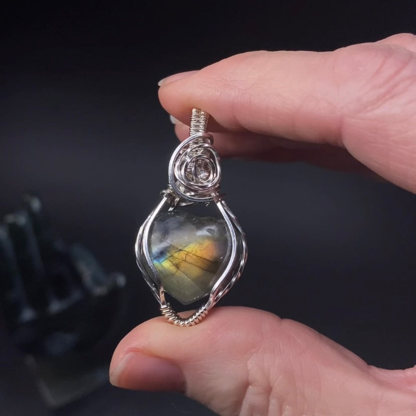 Yellow and blue flash labradorite heart wrapped in sterling silver wire with swirled accents. The pendant is reversible.