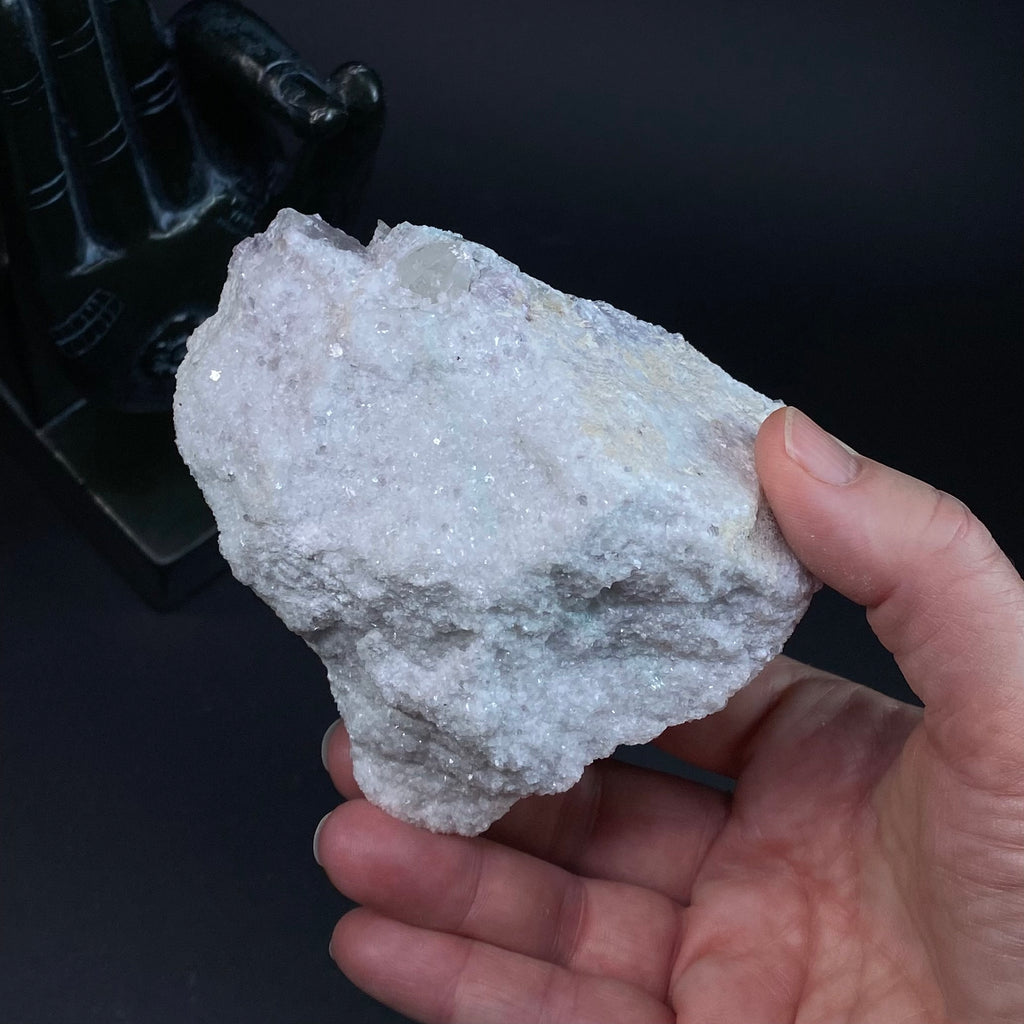 Green tourmaline crystals, with lepidolite & quartz, on a white crystalline matrix. From Laghman, AfghanistanSize: 90 x 80 x 45 mm. 520 grams