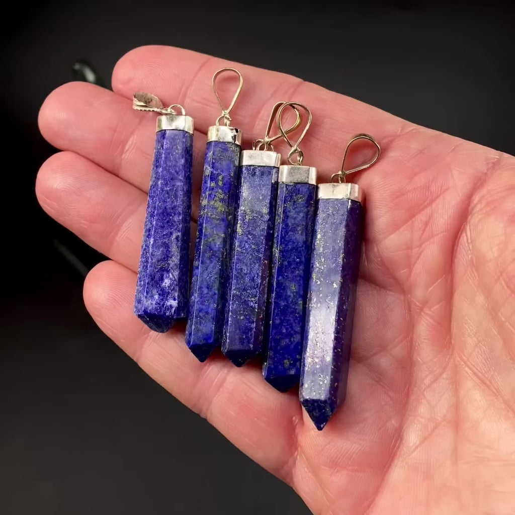 This listing is for ONE (1) polished lapis lazuli tower pendant. Each pendant has a beautiful lapis lazuli & pyrite polished tower, with a silver color bail. Some parts are sterling silver and will need occasional polishing.