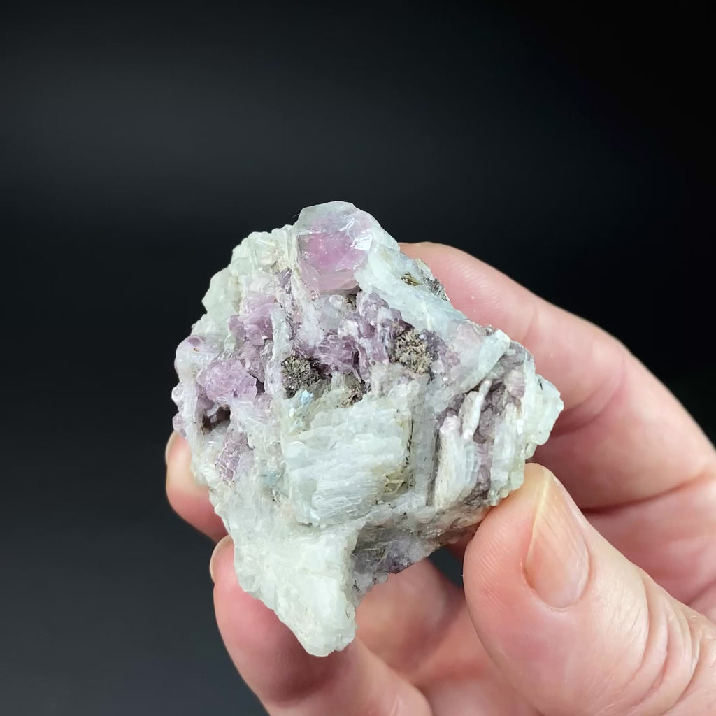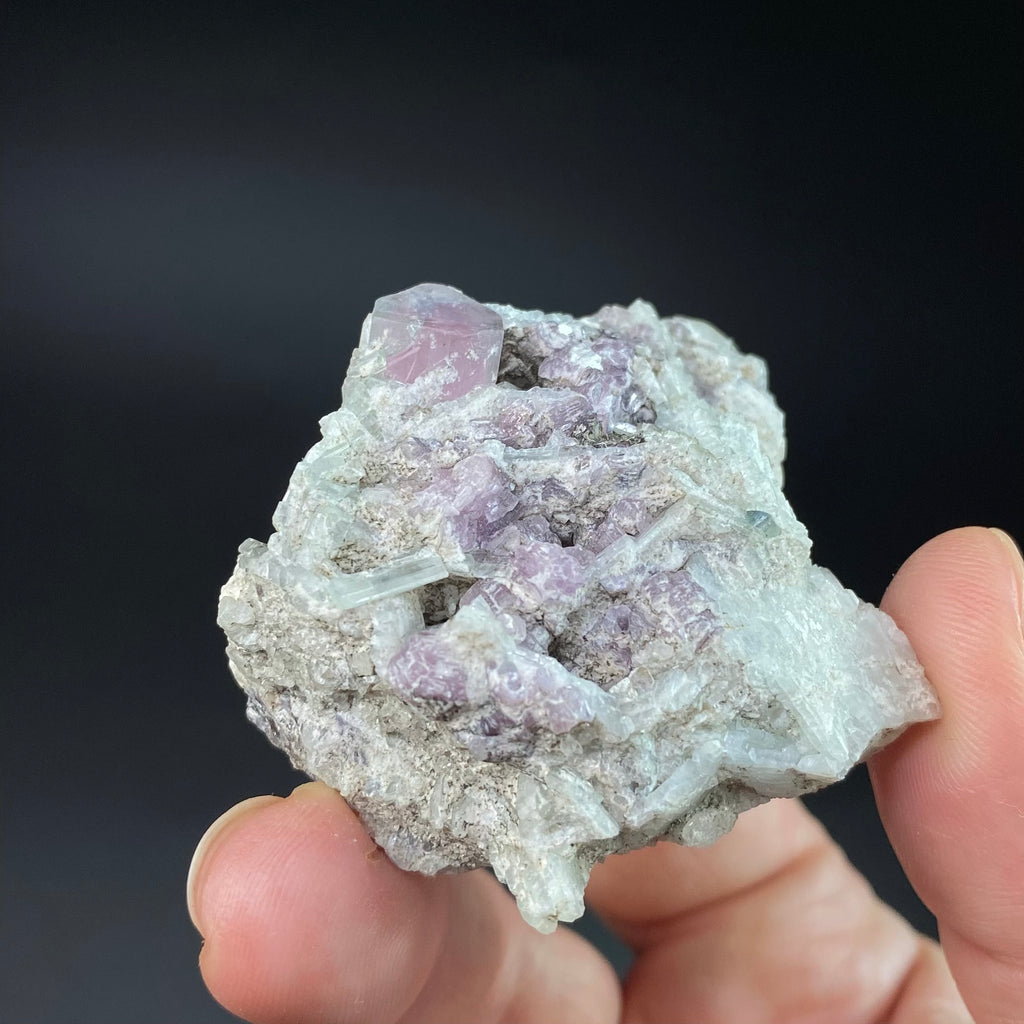 Terminated pale green and pink watermelon tourmaline crystal with lepidolite and cleavelanditeLocation: Pech, AfghanistanSize: 40 x 30 x 30 mm.. 63 grams