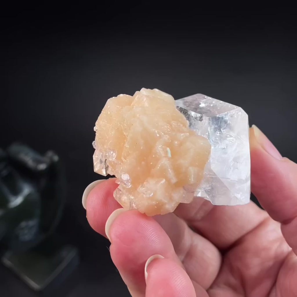Gorgeous cluster of clear apophyllite and peach stilbite.