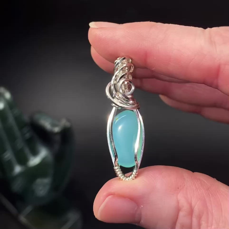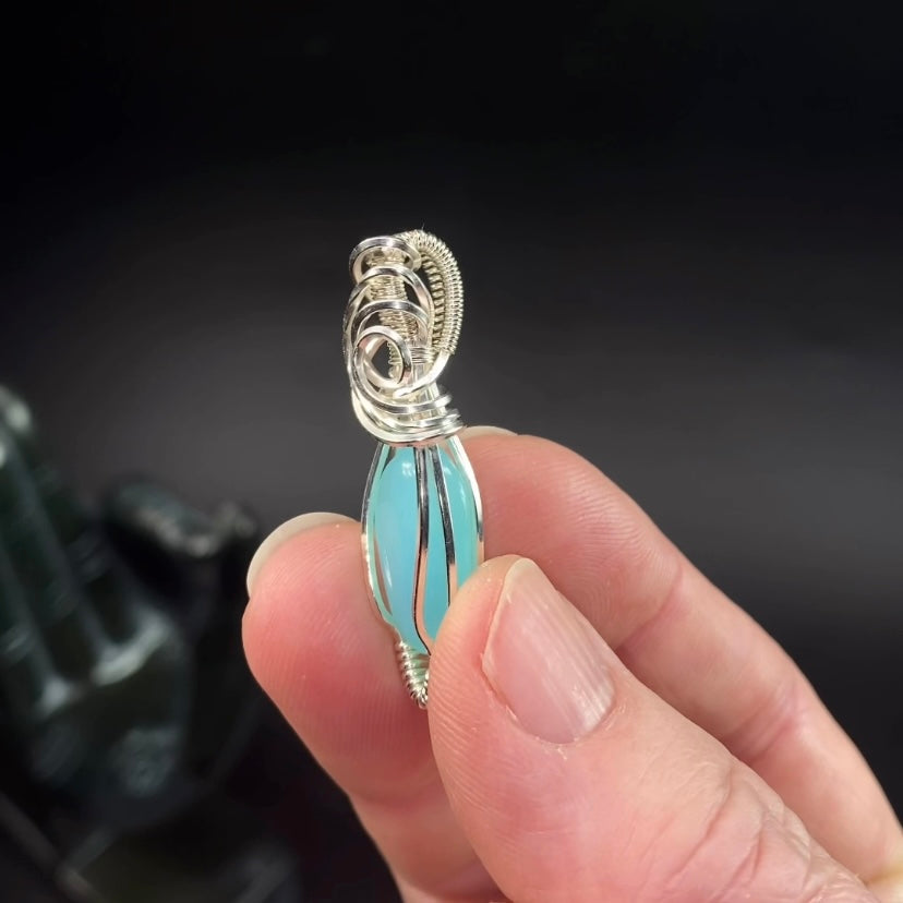 Peruvian Blue Opal is a common opal and does not show play-of-color. This material is sourced from Peru and is valued for its smooth texture and calming coloration. Each wire wrap is individually crafted, making this pendant truly unique.