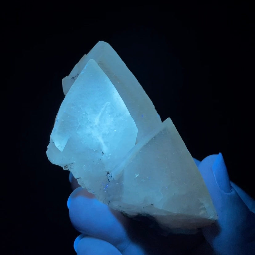 The cluster displays brief green phosphorescence with 365nm long wave ultraviolet light. Size: 56 x 74 x 30 mm. 106 grams.