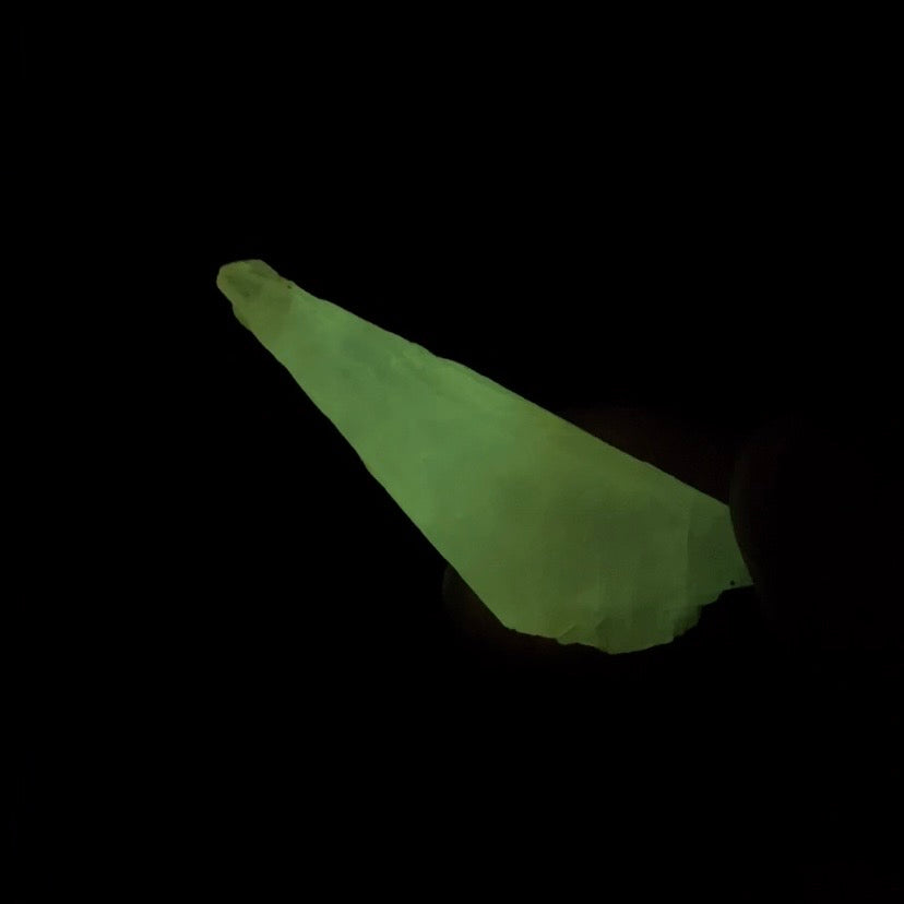 Tapered golden calcite crystal. The calcite is fluorescent and phosphorescent with 365nm long wave ultraviolet light.