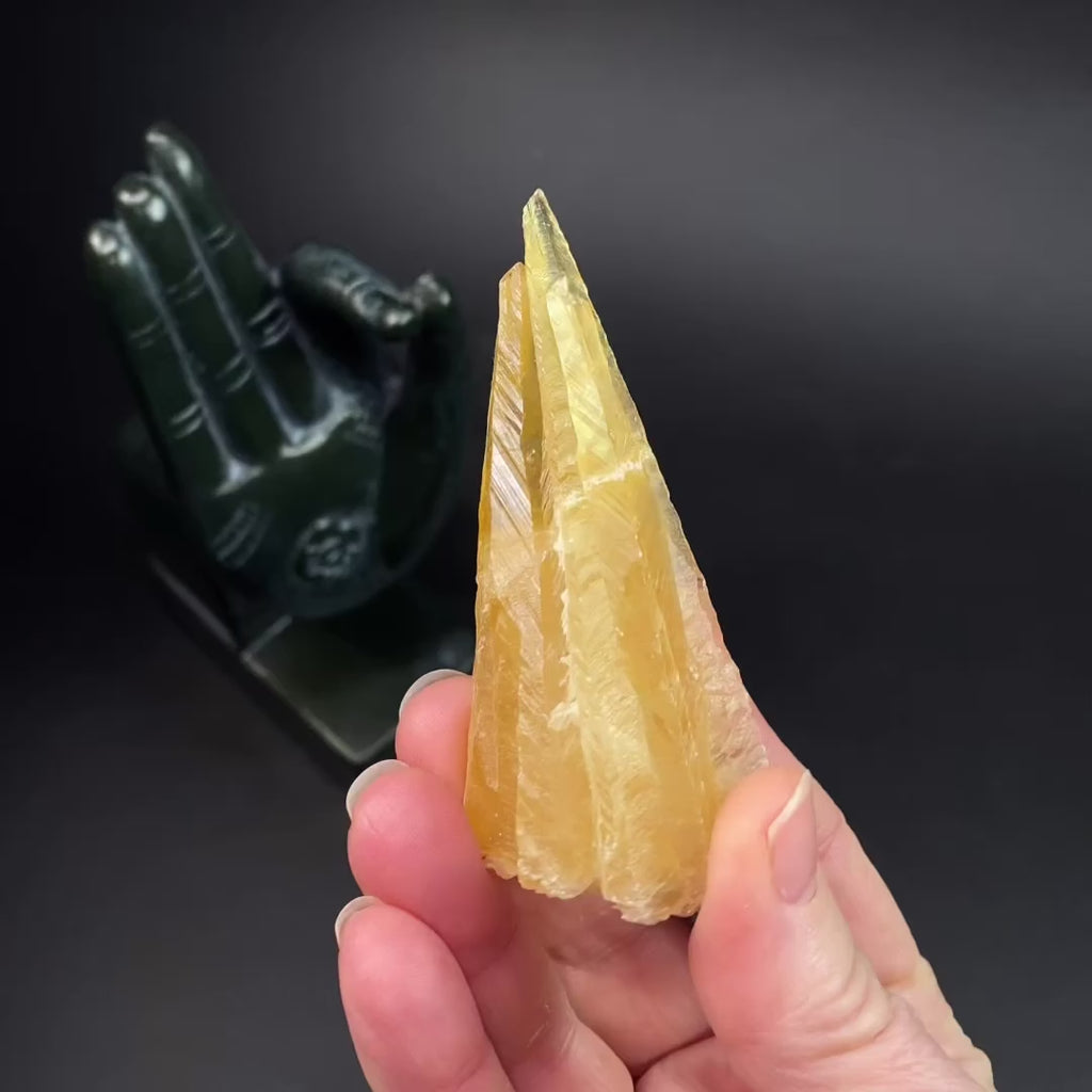 Tapered golden calcite crystal. The calcite is fluorescent and phosphorescent with 365nm long wave ultraviolet light.