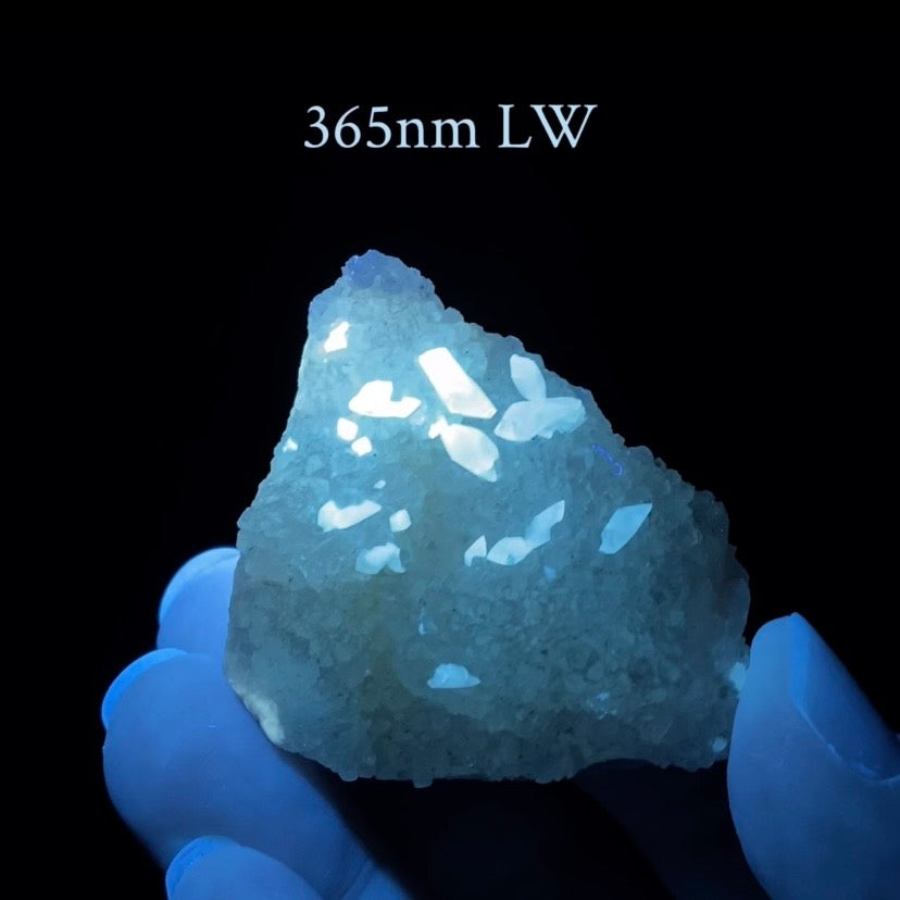 That color mix — cyan fluorescence with greener afterglow - is consistent with Mn-activated calcite with minor secondary activators and