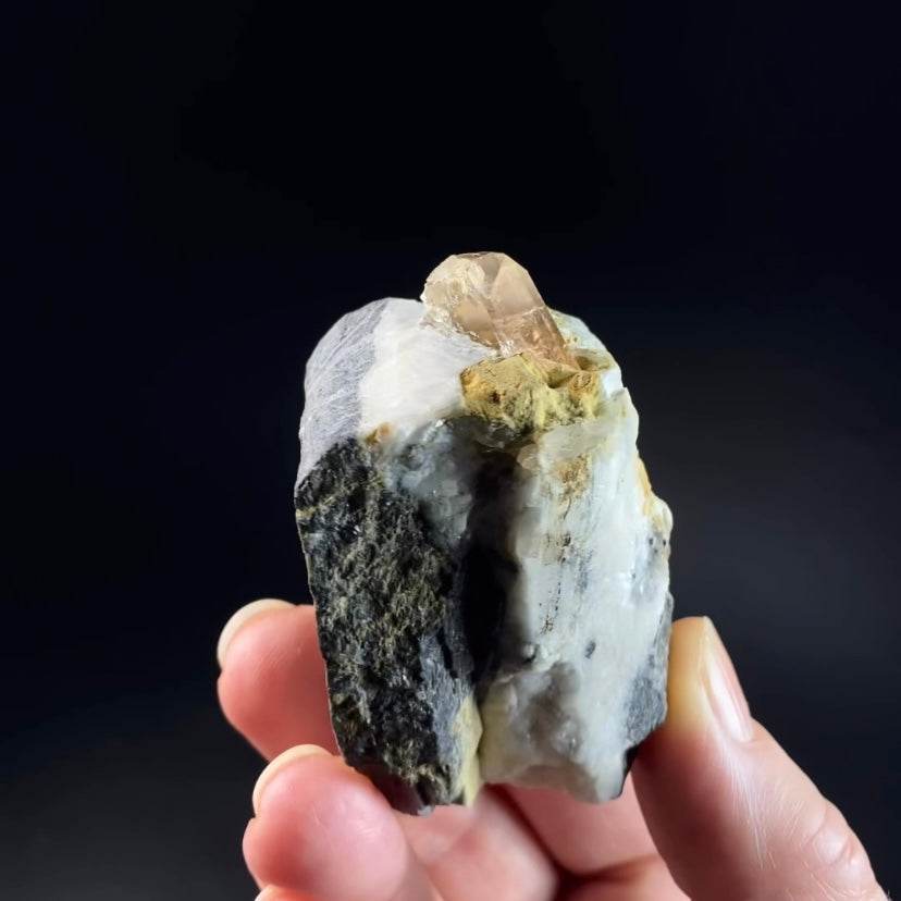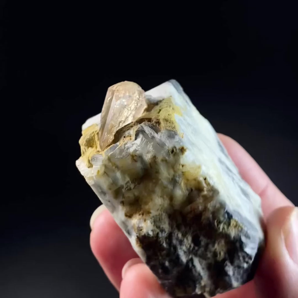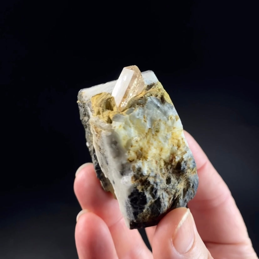 Gorgeous peach color Katlang imperial topaz crystal with lustrous prism faces and sharp termination on a matrix of biotite-muscovite schist with quartz and feldspar.